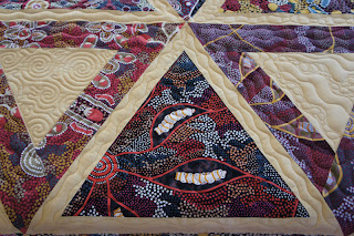 I did some custom work on Debra's quilt.  I wanted the quilting to be very organic because the fabrics have caterpillars, snakes, geckos and lots of simple movements in the fabrics.  I did alot of squiggly lines, pebbles and swirls.  There is alot of quilting in the darker fabrics which unfortunately doesn't show up, but you can see the efforts in the solid fabrics.  Nice work as always Debra!  Hope you like the way it turned out.  Take care,  Richla
